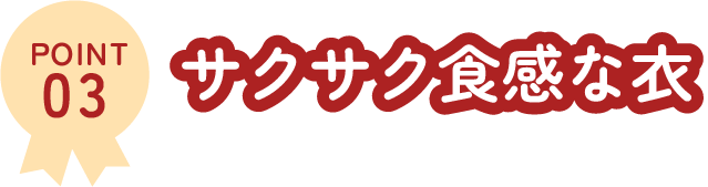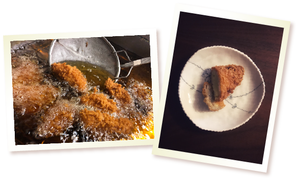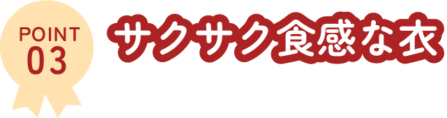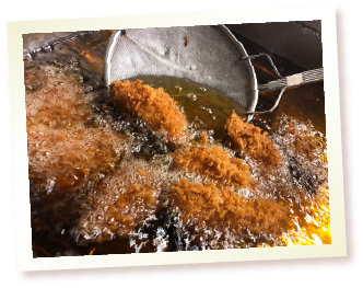 自社オリジナルブレンドの粗めに粉砕した生パン粉を使用し、ひとつひとつ心を込めて丁寧に衣付けをし、サクサクな食感の仕上げとなっております。