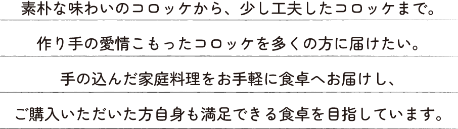 北海道産の素材を出来る限り使用しております。コロッケに使用するじゃがいもは羊蹄山麓で収穫された物を主に使用し、クリームコロッケのベシャメルソースは北海道産の牛乳から脱脂粉乳などを一切使用せずにまろやかで濃厚な仕上がりとなっております。